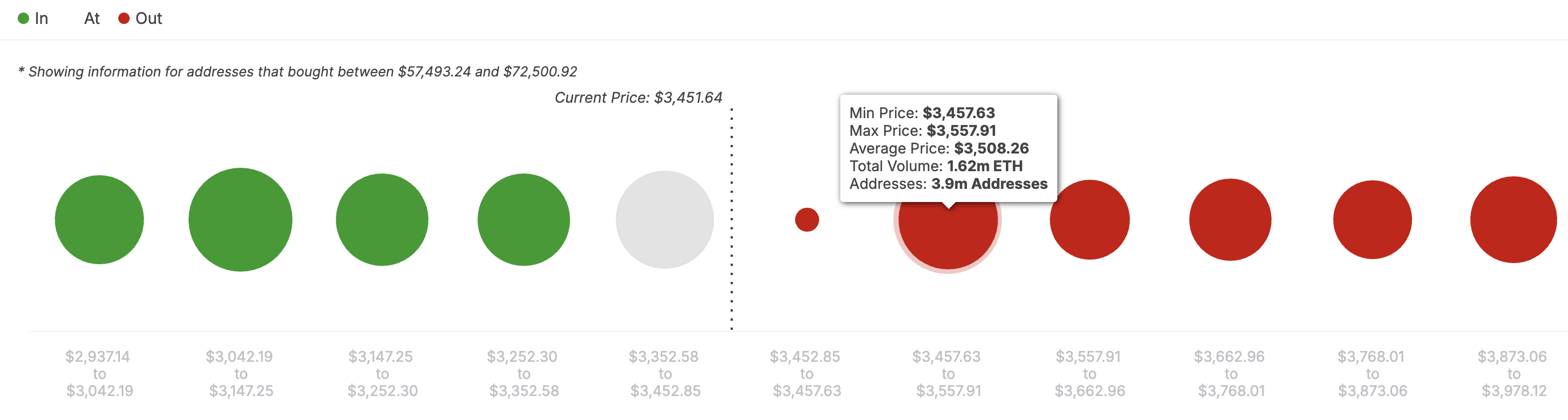 Selon l’indicateur In/Out of Money Around Price (IOMAP), le cours d’Ethereum bénéficie d’un fort support à 3 352 $. À ce stade, 3,34 millions d’adresses Ethereum détiennent 3,18 millions de pièces et sont actuellement en profit.