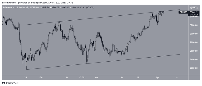 Le graphique sur six heures montre qu’Ethereum se négocie à l’intérieur d’un canal parallèle ascendant depuis le 24 janvier. Actuellement, il se trouve juste en dessous de la ligne de résistance du canal.