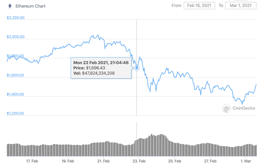 La hausse drastique des frais de transaction d’Ethereum (ETH) s’est produite au moment où l’ensemble du marché de la cryptomonnaie a chuté dans le rouge le 22 février. Ce jour-là, le cours de l’ETH est passé sous la barre des 1 700 $, chutant de plus de 12%.