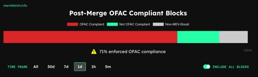 Actuellement, 71 % des blocs Ethereum sont conformes à la réglementation de l’OFAC. Un chiffre qui a considérablement augmenté par rapport à fin septembre où il ne dépassait pas les 25 %.