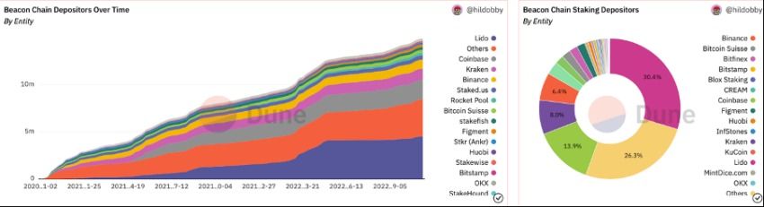 Les données de Dune Analytics révèlent que Lido gère 4 529 312 des ETH placés en staking, soit 30,4 % du pool total. Coinbase (13,89%) et Kraken (7,99%) arrivent respectivement en deuxième et troisième position.