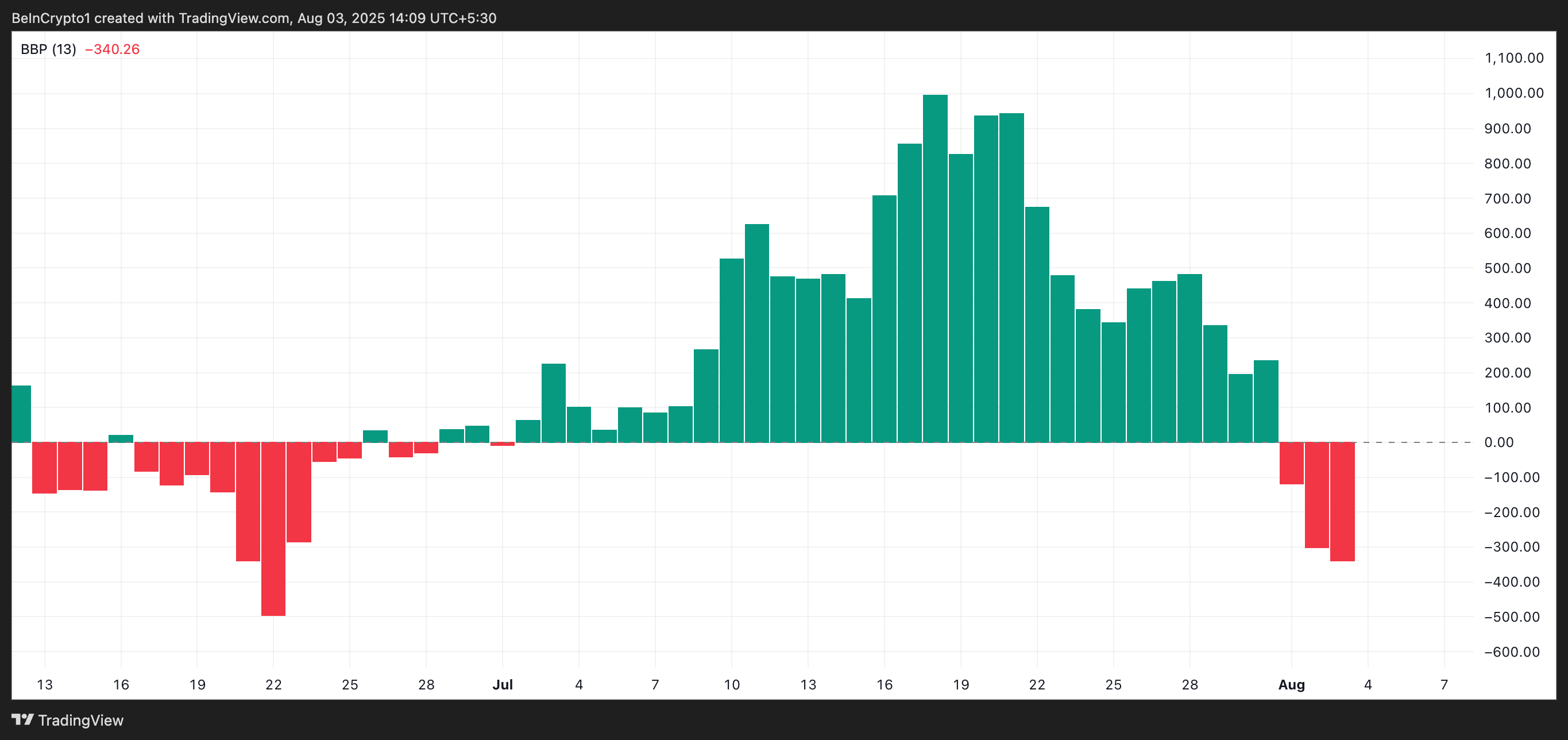 Le ratio d’accumulation des holders a chuté à 27.57 %, montrant que peu d’investisseurs augmentent leurs avoirs. Parallèlement, l’indicateur Elder-Ray Index affiche -342.73, avec plusieurs barres rouges consécutives, preuve que la pression vendeuse s’intensifie et domine le marché.