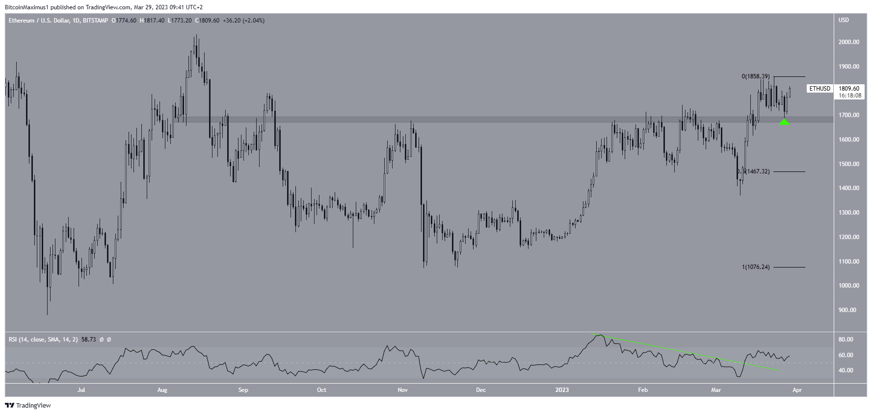 Si la hausse se maintient, l’ETH pourrait monter jusqu’au moins 2 000 dollars. Au contraire, si le cours clôture sous 1 685 $, il pourrait alors chuter jusqu’au support du retracement 0,5 de Fibonacci, à 1 465 $.