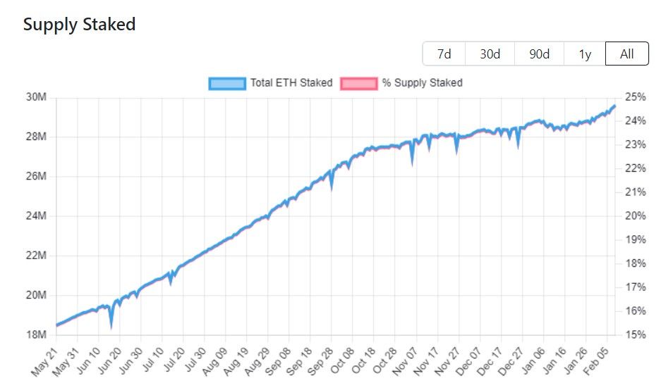 A l’heure de la rédaction de cet article, il semble peu probable qu’Ethereum voie son cours baisser à nouveau. La création de Vitalik Buterin semble avoir retrouvé les faveurs du public avec 25 % de son approvisionnement total placé en staking. Du jamais vu depuis son lancement !