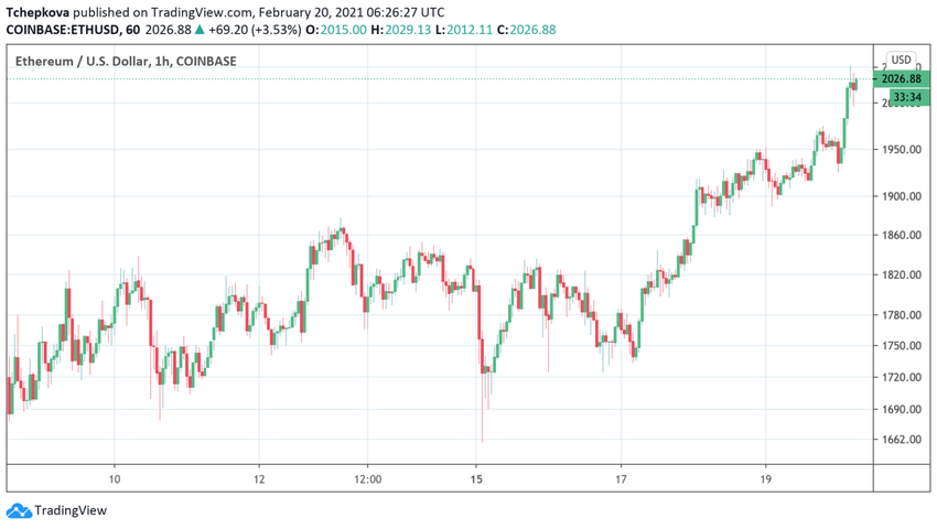 Ethereum (ETH), le deuxième plus grand actif numérique en termes de capitalisation de marché, a franchi le cap des 2 000$ et a atteint un nouveau record de 2 042$ aux premières heures du matin en Asie le 20 février.