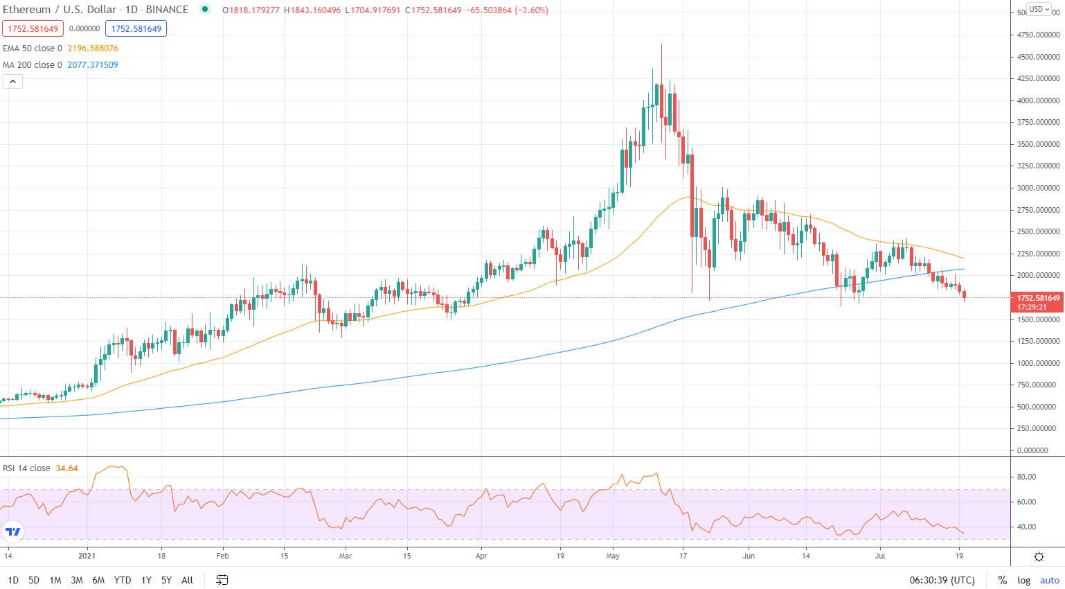 SponsoredL’ETH se situe actuellement à un niveau de support horizontal de long terme, mais une croix de la mort (death cross) est imminente sur l’échelle de temps quotidienne. Si les marchés ne se redressent pas, ce croisement pourrait se produire avant la fin juillet, ce qui signifie que le creux de 1 559 dollars ou même moins, est probable.