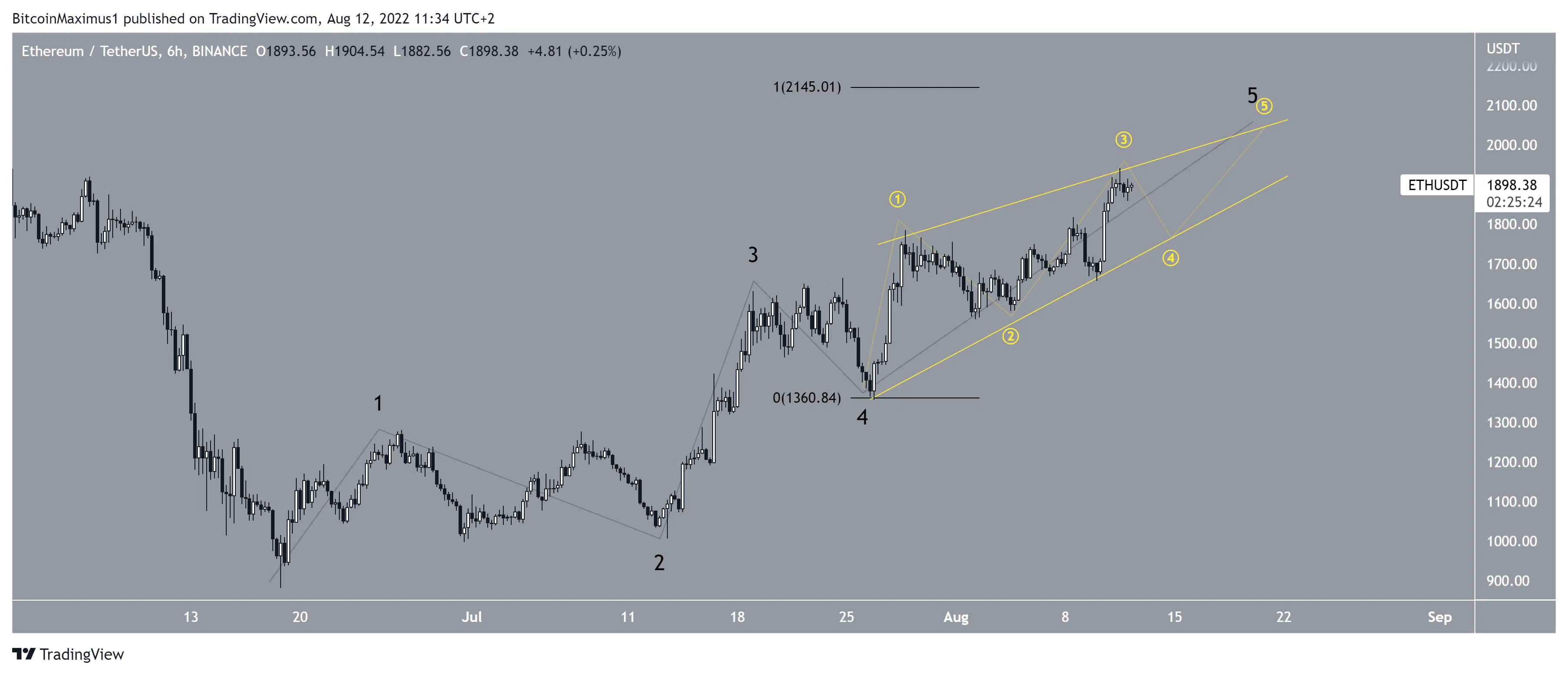 Le décompte des vagues suggère que le cours ETH a entamé un mouvement de hausse en cinq vagues en juin. Dans ce cas, il se trouve actuellement dans la cinquième et dernière vague de ce mouvement.