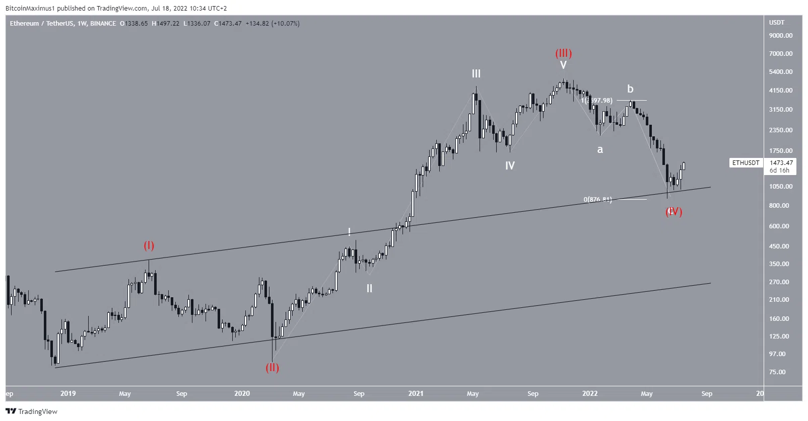 Le décompte de vagues le plus plausible suggère qu’ETH a complété son mouvement de déclin en cinq vagues, lequel a démarré en mars 2020 (en blanc). De plus, il semblerait qu’il ait complété une structure en A-B-C, laquelle donne aux vagues A:C un ration exact de 1:1. Il s’agit là du ratio le plus courant de ce type de structures.