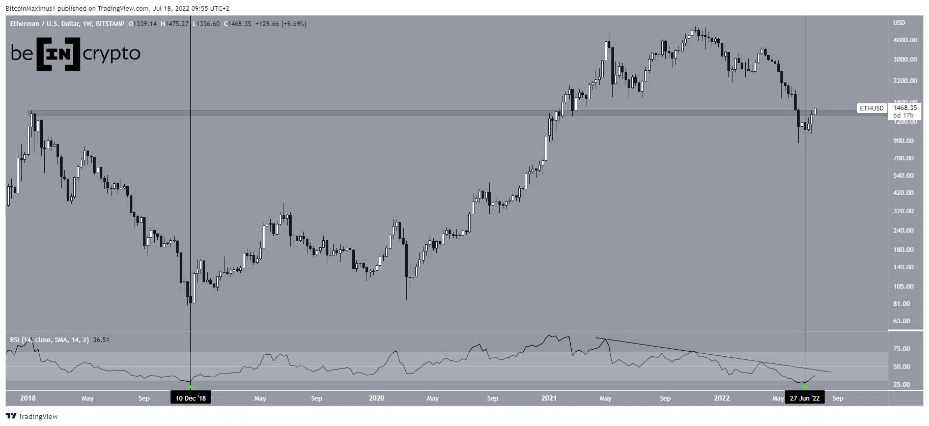 Le cours ETH évolue à la baisse depuis son sommet record de 4 868 $ atteint en novembre 2021. Le mouvement de déclin a jusque-là mené à un creux de 880 $ atteint en juin 2022. Cela a entraîné une chute du RSI en territoire de survente, pour la première fois depuis le bottom de décembre 2018 (lignes verticales).