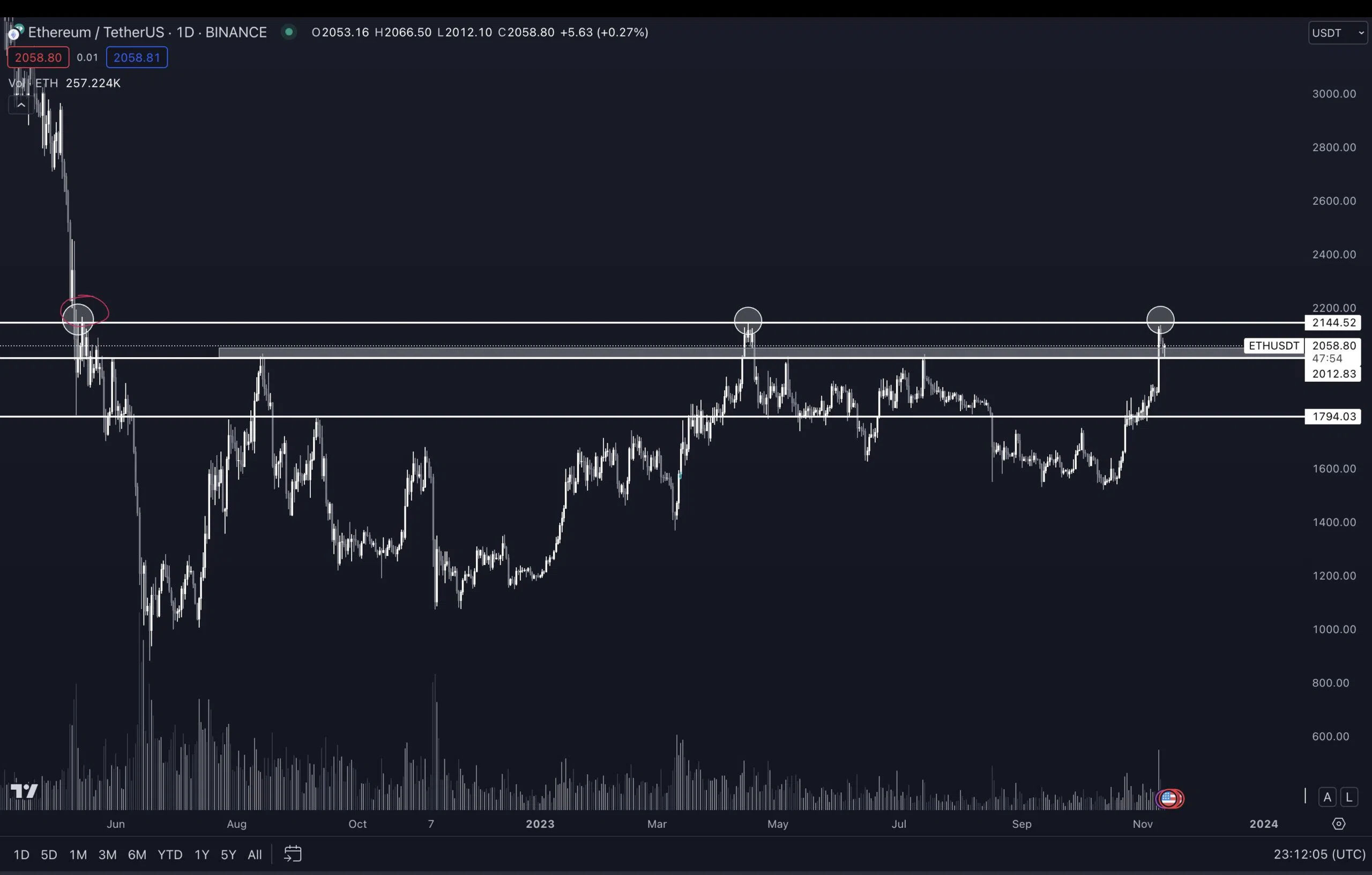 Après cette rupture, Ethereum a atteint un sommet de 2 136 $ avant de retomber à 2 060 $. Ce nouveau pic était légèrement inférieur au sommet annuel de 2 140 $.