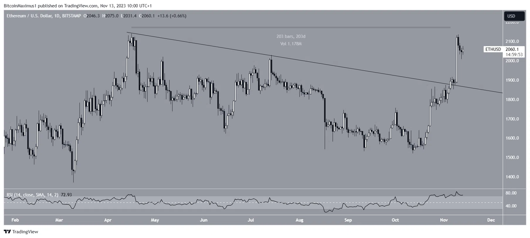 L’analyse technique du graphique quotidien montre que le cours Ethereum a brisé une ligne de résistance descendante le 5 novembre. Au moment de la rupture, la ligne de résistance était en place depuis plus de 200 jours.