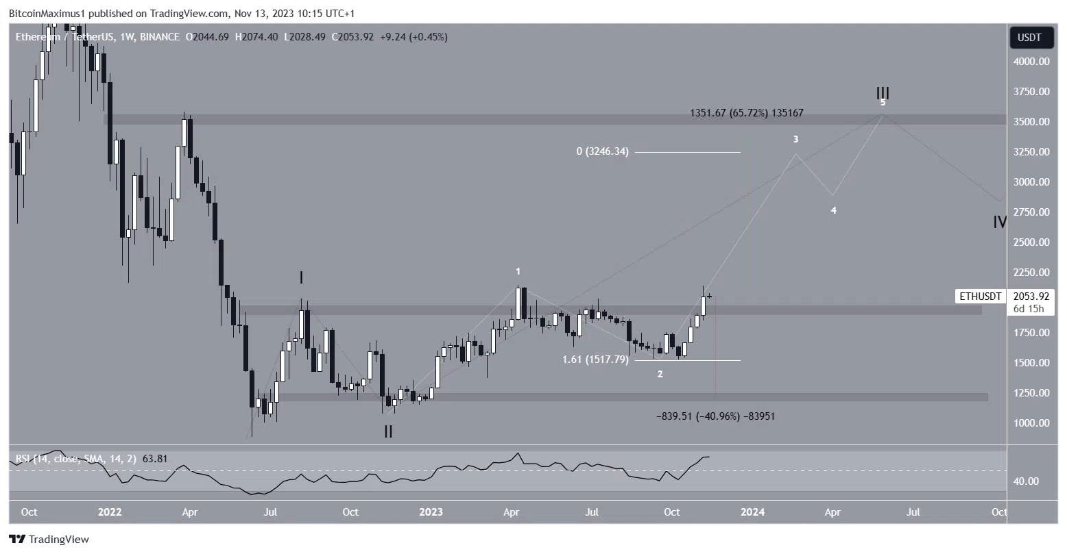 En effet, l’analyse du graphique indique que le cours ETH se trouve actuellement dans la troisième vague d’un cycle haussier en cinq vagues (noir), qui a commencé en juin 2022.