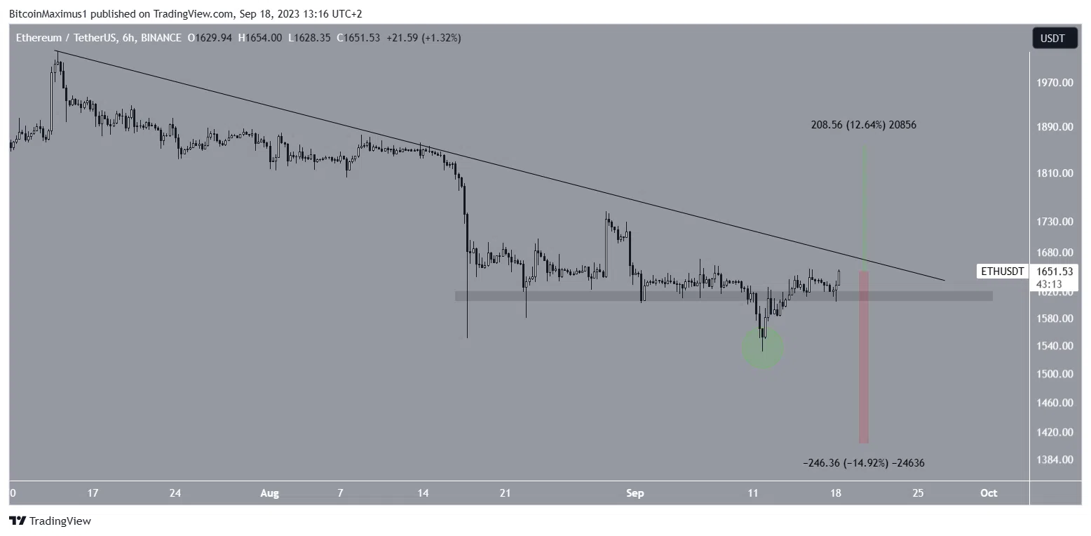 Les données de plus court terme, sur six heures, nous montrent que le cours de l’ETH évolue à la confluence de plusieurs niveaux critiques. Premièrement, l’actif s’échange au sein du support horizontal de 1 615 $. Cette zone existe depuis le 17 août, à l’exception d’une déviation le 11 septembre (cercle vert). Cette déviation suivie du regain de la zone constitue un signe haussier, qui devrait conduire à une forte hausse si l’ETH se maintient au-dessus de son support.