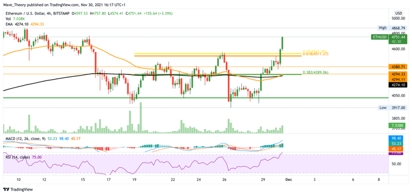 Il a toutefois pu se maintenir à ce support significatif, et l’ETH se trouve depuis dans un mouvement continu de hausse. Ainsi, la résistance horizontale située à environ 4 300 $ ainsi que le Golden Ratio à environ 4 500 $ ont depuis tous deux été dépassés. Le prix de l’ETH est donc presque revenu à son sommet historique, situé à environ 4 900 dollars.