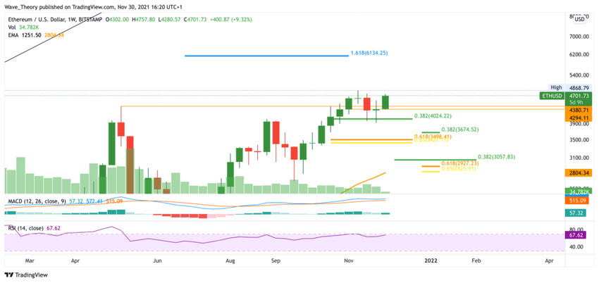 Ethereum a démarré cette semaine de manière encore plus haussière et, à 4 700 $, l’ETH n’est plus qu’à quelques dollars de son sommet historique. Au sein du graphique hebdomadaire, l’histogramme de la MACD est actuellement haussier à nouveau.
