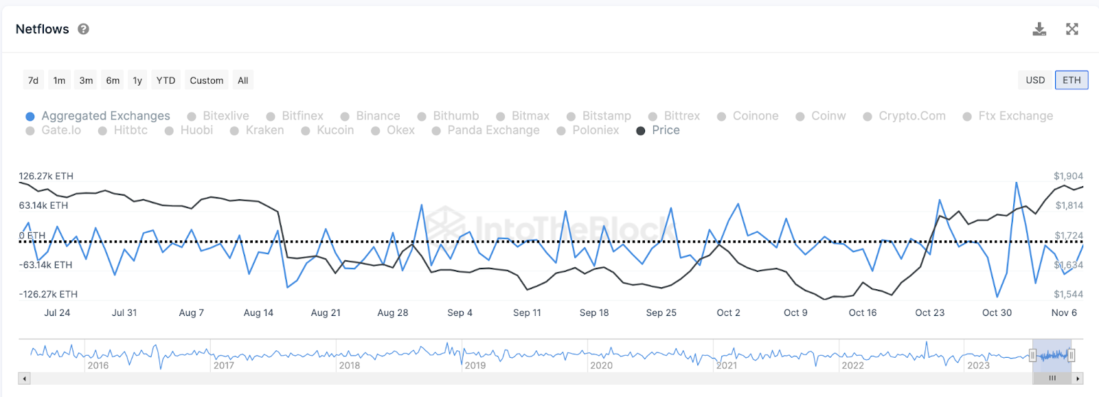 À en croire les données d’IntoTheBlock, les flux nets d’Ethereum dans les principales bourses crypto ont été négatifs au cours des sept derniers jours. Rien qu’entre le 3 et le 9 novembre, les investisseurs ont transféré 263 520 ETH des exchanges vers leurs portefeuilles personnels.
