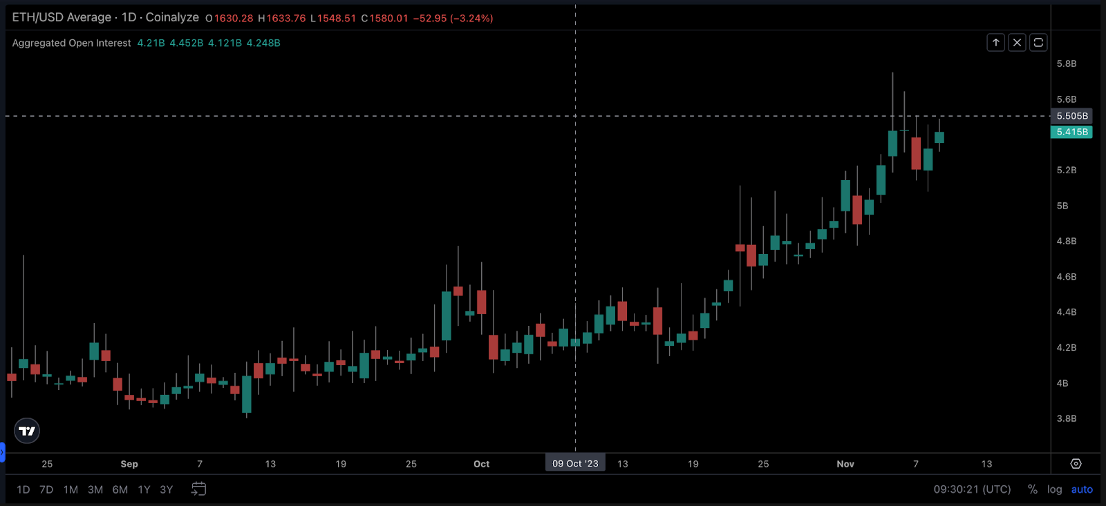 Comme le montre le graphique ci-dessous, l’intérêt ouvert des contrats à terme sur Ethereum s’élevait à 4,20 milliards de dollars à la clôture du 8 octobre. Au 9 novembre, ce chiffre est passé à 5,42 milliards de dollars, ce qui représente un afflux d’investissements de 1,22 milliard de dollars en un mois.