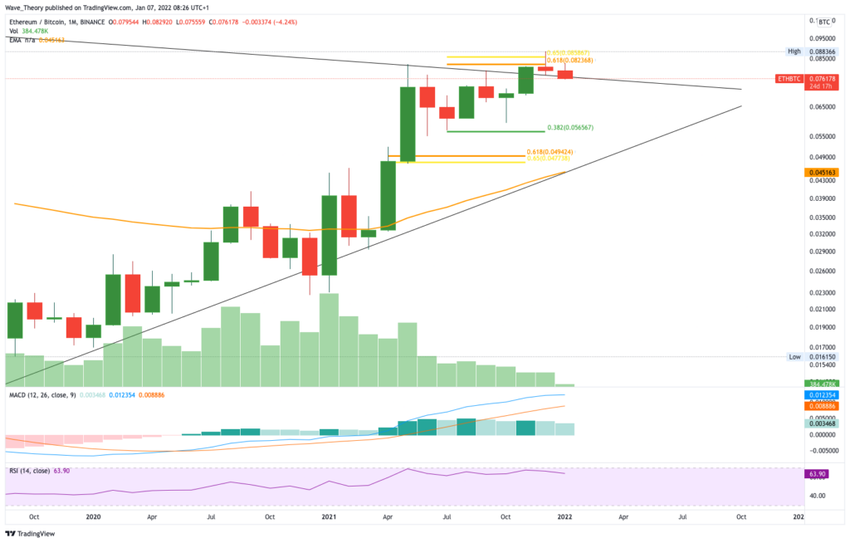 Dans sa paire en BTC, le cours d’Ethereum vient de subir un rejet au niveau de la Golden Ratio, à environ 0,085 BTC. L’ETH pourrait revenir au support de Fibonacci 0,382 à 0,056 BTC ou même au Golden Ratio situé à 0,05 BTC.