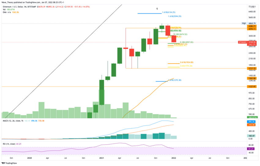Si Ethereum passe la barre des 3 000 dollars, il trouvera un support massif au plus tard aux alentours de 1 300 dollars. C’est là que se trouve non seulement un important niveau de Fibonacci, mais aussi la MA sur 200 semaines ainsi que la MA sur 50 mois.