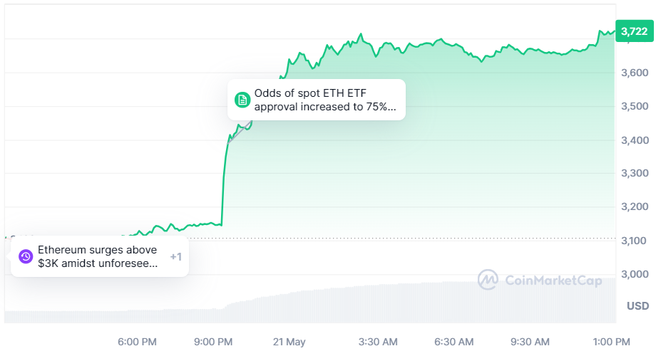 L’industrie est en ébullition depuis que la rumeur d’une possible approbation des ETF Ethereum s’est répandue dans la communauté. Par conséquent, l’ETH a largement dépassé la barre des 3 000 $ pour stagner ce matin à 3 700 $. A quoi pouvons-nous nous attendre par la suite ?