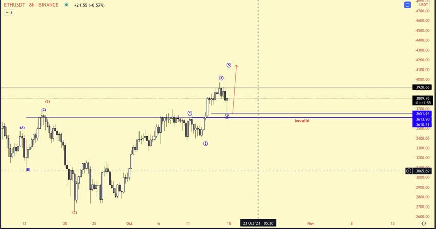 Le compte des vagues de plus long terme (en orange) montre que l’ETH a déjà complété une impulsion haussière durant la période du 19 juin au 4 septembre, culminant avec le sommet susmentionné de 4 047 $.