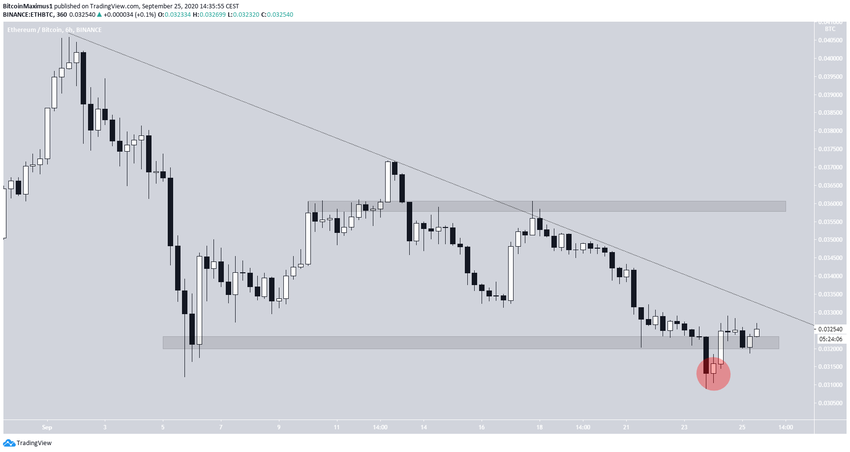 Le graphique de l’ETH/BTC semble plus baissier que son homologue en USD. Le cours n’a pas créé de chandelier japonais de recouvrement haussier, et il n’y pas non plus le moindre signe de revirement dans les données à la journée.
