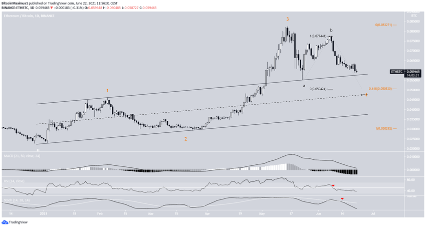 La paire ETH/BTC nous donne une perspective pareillement baissière. Le cours est en déclin depuis qu’il a créé un sommet inférieur le 9 juin.