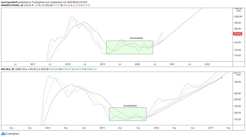 Le trader crypto @Iamcryptowolf a partagé un graphique de l’ETH. Il y remarque que la lecture de la moyenne mobile (MA) tout au long de l’année dernière est étonnament similaire à celle du BTC en 2015, avant le bull run qui l’a fait monter à son sommet historique.