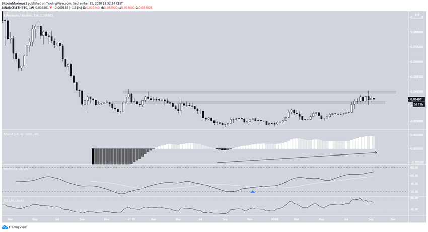 La paire EH/BTC présente une lecture très similaire de ses indicateurs techniques à la semaine. L’oscillateur stochastique a déjà formé un croisement haussier et la MACD est en hausse. Le RSI est survendu, mais il n’a pas encore formé la moindre divergence baissière.