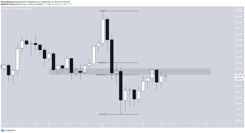 En observant de plus près le graphique journalier, on voit que l’ETH a été rejeté par la zone des 390$. Ce dernier correspond au précédent support devenu résistance et se trouve entre les niveaux fibonacci 0,382 et 0,5 de l’entier déclin antérieur.