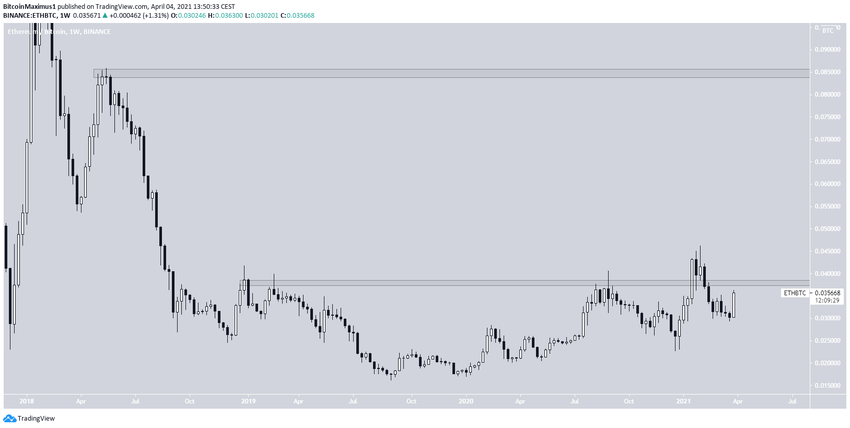 Le graphique hebdomadaire montre que malgré l’actuelle hausse, l’ETH s’échange toujours en-dessous de la résistance située à 0,038₿. À l’exception d’une légère déviation en février, cette zone de résistance est en place depuis fin 2018.