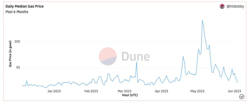 Depuis le pic de mai, le prix moyen quotidien du gaz en gwei, soit un milliardième de 1 ETH, est passé de 142 en mai à 22 en juin à l’heure où nous rédigeons ce rapport.