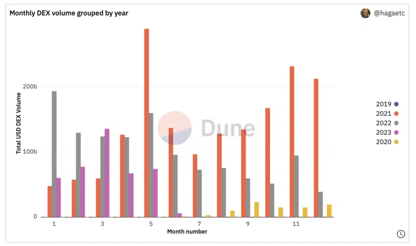 Les volumes combinés des DEX sont montés à 74 milliards de dollars en mai, contre 67 milliards de dollars le mois précédent. Ce, d’après le tableau de bord des volumes DEX de Dune Analytics de Hagaetc.