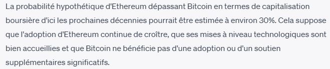 D’ailleurs, ChatGPT table à seulement 30 % les probabilités qu’Ethereum dépasse un jour Bitcoin en termes de market cap. Par le passé, le chatbot avait déjà commenté le duel entre les deux plus grosses cryptomonnaies du secteur en donnant le BTC largement vainqueur.