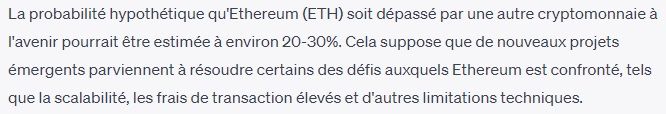 Pour le Chatbot, les probabilités qu’Ethereum se fasse dépasser sont très maigres, avec seulement 20 à 30 %. Toutefois, peut être que des projets émergents et globalement méconnus pourraient être à surveiller à l’avenir.
