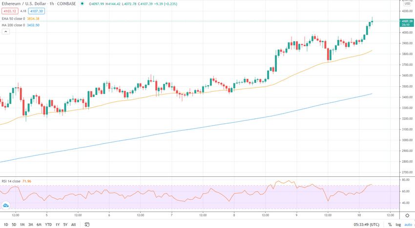 Le cours d’Ethereum (ETH) a affiché une action haussière le matin du 10 mai, montant au-dessus de 4 000 dollars pour la toute première fois.