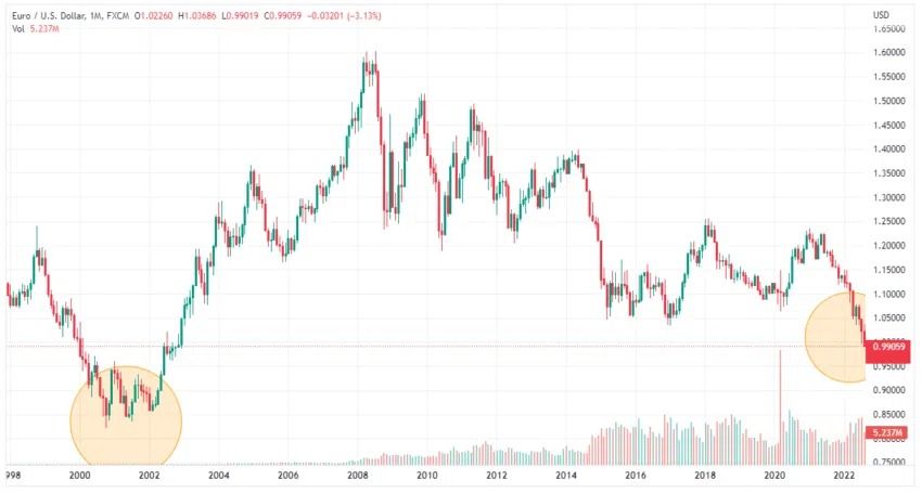 EUR/USD : Après avoir repris des couleurs, l’euro vient de retomber sous le dollar américain pour la deuxième fois en 20 ans.