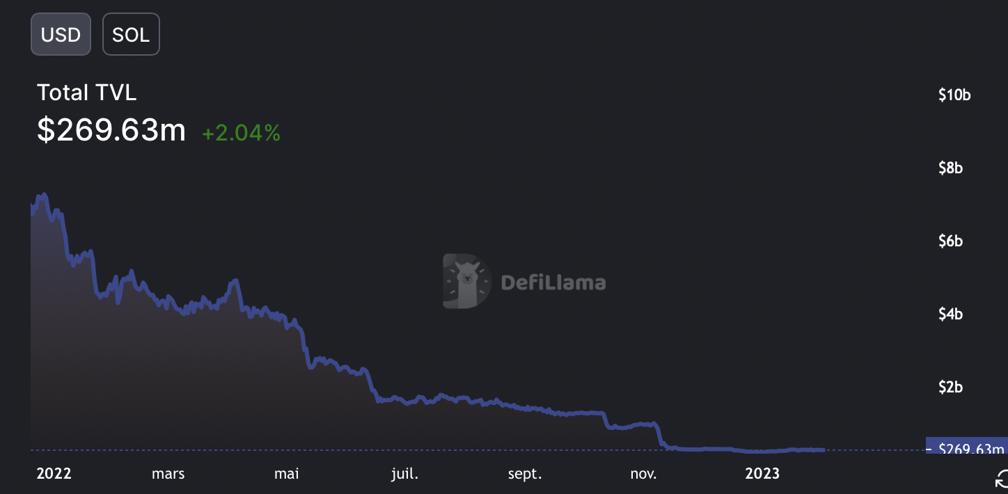 Depuis l’effondrement de FTX, beaucoup de projets de Solana, à l’instar de MoonFarm, Serum Oxygen et tant d’autres encore, qui sont en majeure partie financée par Alameda Research, se sont retrouvés en situation de crise. Une situation qui a largement impacté l’écosystème DeFi de la blockchain Solana. Entre novembre à janvier 2023, la TVL (Valeur totale verrouillées) sur le réseau SOL est passé de 1 milliard. à 270 millions de dollars. La blockchain qui devait faire rude concurrence à l’Ethereum se place actuellement à 12ème place en termes de TVL par projet.