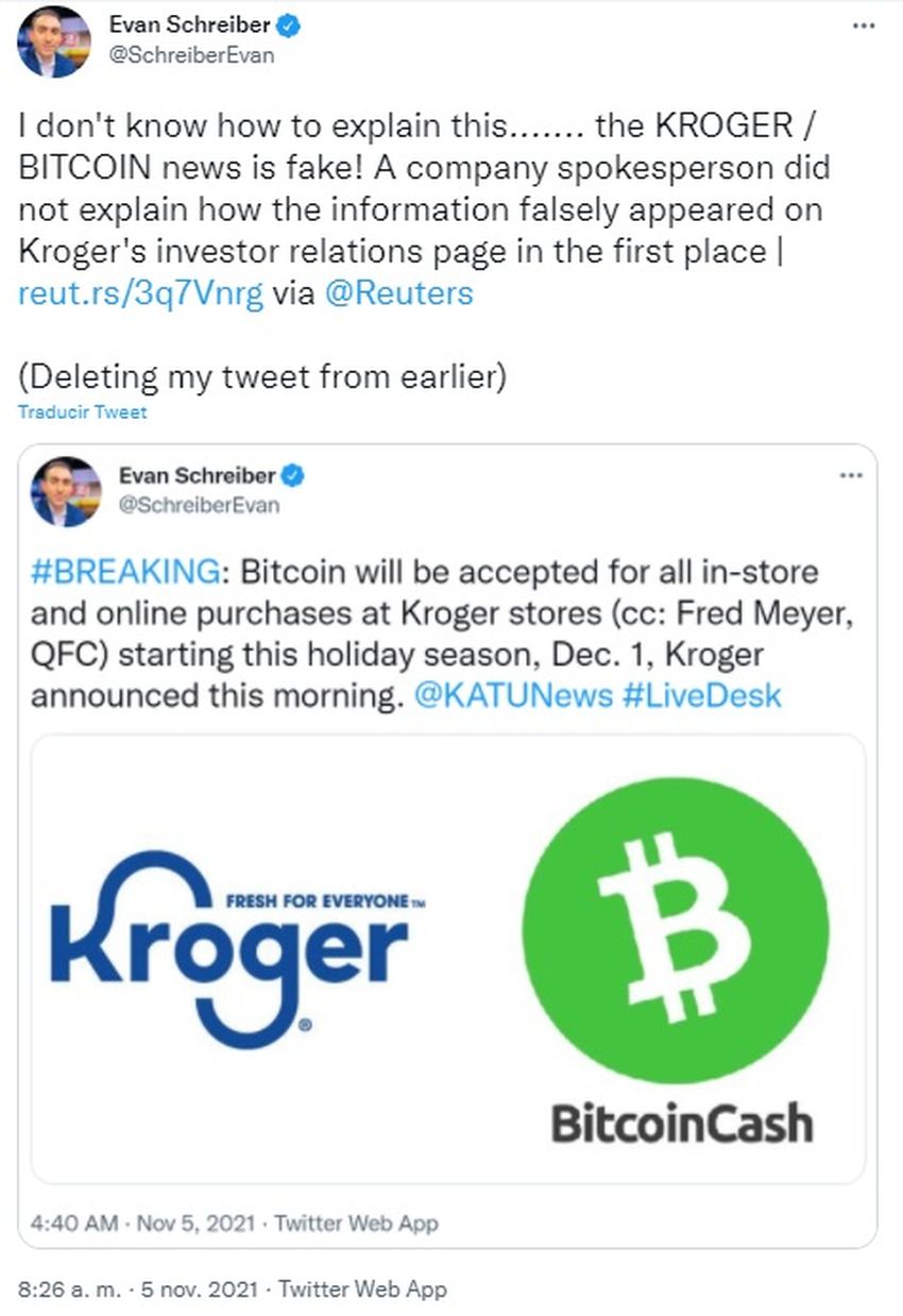 Par le biais d’un e-mail adressé à Reuters, un porte-parole de Kroger a déclaré que le communiqué, qui parlait des projets de l’entreprise d’accepter Bitcoin Cash (BCH) comme moyen de paiement, constitue un cas de fake news :