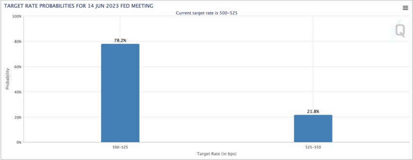Néanmoins, d’après la plateforme FedWatch du CME, la probabilité d’une pause avoisine les 78 %. Après cette pause temporaire, la Fed pourrait relever ses taux d’un quart de point en juillet.
