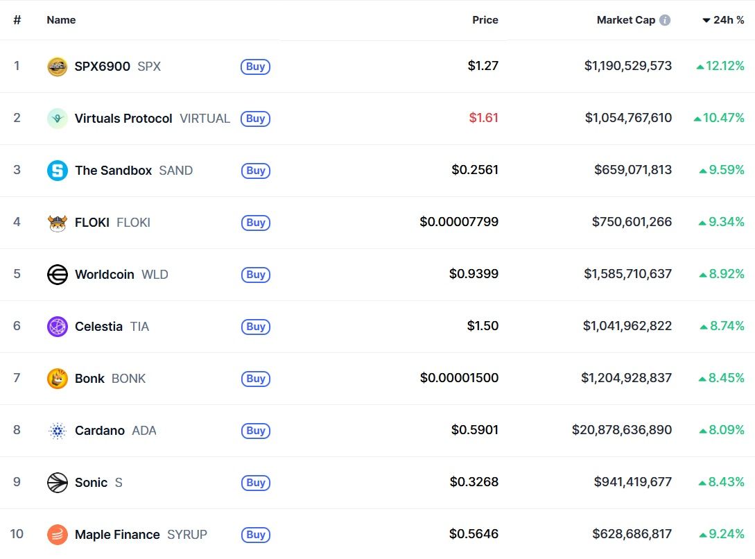 Les principaux altcoins ont réagi positivement à cette dernière hausse et se rapprochent voire dépassent les 10 % de positif aujourd’hui. VIRTUAL et SPX intègrent cette catégorie, avec des gains respectifs de 12,12 % et de 10,47 %.