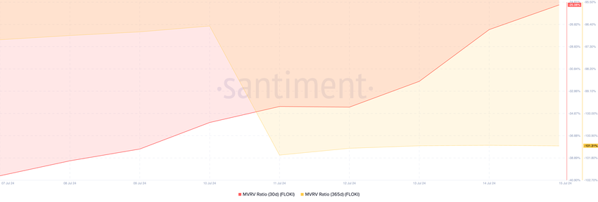 Le ratio MVRV de ce token affiche des valeurs négatives lorsqu’il est comparé à différentes moyennes mobiles. Plus précisément, les ratios MVRV de FLOKI pour les moyennes mobiles de 30 jours et de 90 jours étaient respectivement de -25,06 % et -101,31 %, au moment de la rédaction.