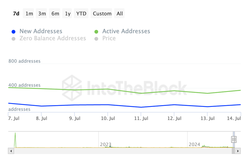 Les statistiques d’IntoTheBlock révèlent une diminution de 11 % du nombre d’adresses impliquées quotidiennement dans au moins une transaction concernant FLOKI sur la même période.