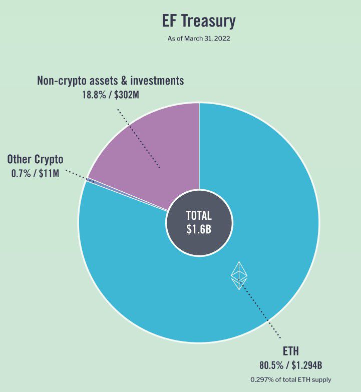 Le rapport révèle qu’à la fin du mois de mars, la Fondation Ethereum détenait une trésorerie d’environ 1,6 milliard de dollars, dont 1,3 milliard de dollars en avoirs crypto. L’organisation à but non lucratif a également déclaré qu’au cours de la même période, 99,1% de ses avoirs en crypto étaient détenus en ETH, ce qui représente près de 0,297% de l’offre totale d’ETH.