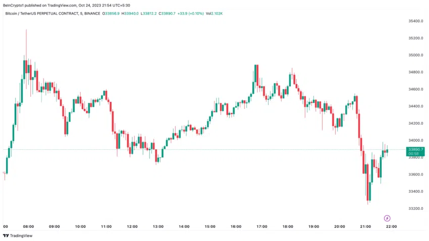 Le marché crypto, pas étranger à la volatilité, a alors réagi avec un mélange de déception et d’inquiétude. Bitcoin a chuté de 5,45 %, atteignant son minimum intra journalier à 33 240 dollars. De son côté, l’analyste technique Nebraskan Gooner a prévenu que la pression de vente sur l’actif pourrait s’accélérer et que le BTC pourrait “revisiter” la zone de support située entre 32 700 et 33 000 dollars.