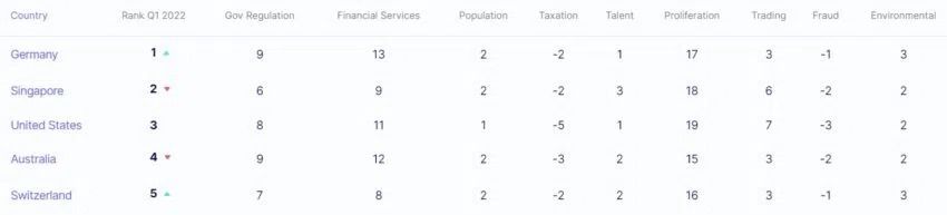 Cependant, sur la liste Coincub des pays les plus favorables à la crypto, l’Allemagne est arrivée en tête du podium au premier trimestre. De son côté, la France s’est hissée en huitième position.