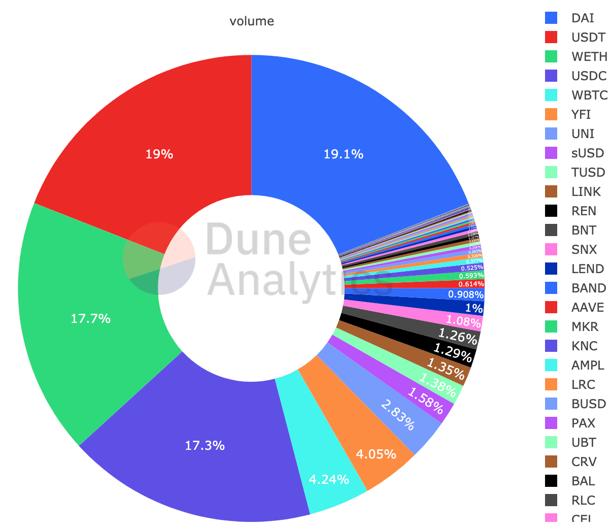 Les tokens faisant l’objet de plus de swaps sont les stablecoins tels que DAI, Tether (USDT), USD Coin (USDC) et le Wrapped ETH (WETH) très utilisé dans les protocoles de la DeFi.