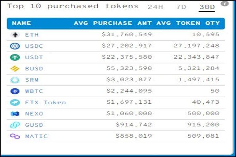 Au cours des 30 derniers jours, qui s’étendent jusqu’à la première semaine de février 2022, FTT est devenue la septième cryptomonnaie la plus achetée, avec un montant moyen d’achat de 1,6 million de dollars et une quantité moyenne de tokens de 40 473.
