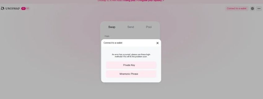 Le principal moyen de différencier le véritable site Uniswap des fraudes réside dans la façon dont les portefeuilles crypto sont connectés. Sur le site Uniswap original, la connexion du portefeuille peut transférer l’utilisateur vers le site du portefeuille ou présenter un code QR afin d’en confirmer la propriété. Sur les faux sites, on observe souvent un message d’erreur ou une demande de clé privée ou de phrase mnémonique.
