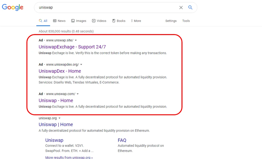 Des recherches Google ont récemment affiché des résultats et des annonces correspondant à au moins trois systèmes de hameçonnage, ou phishing, se faisant passer pour l’exchange décentralisé Uniswap.